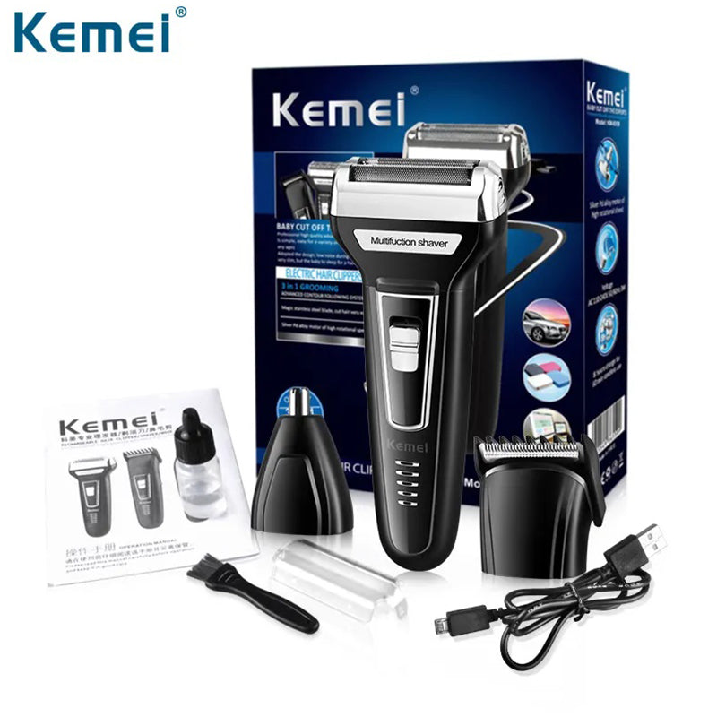 Box includes: 1 x Kemei KM-6559 shaver, nose hair clipper, comb, cleaning brush, charger, oil bottle, instructions manual, and warranty card .