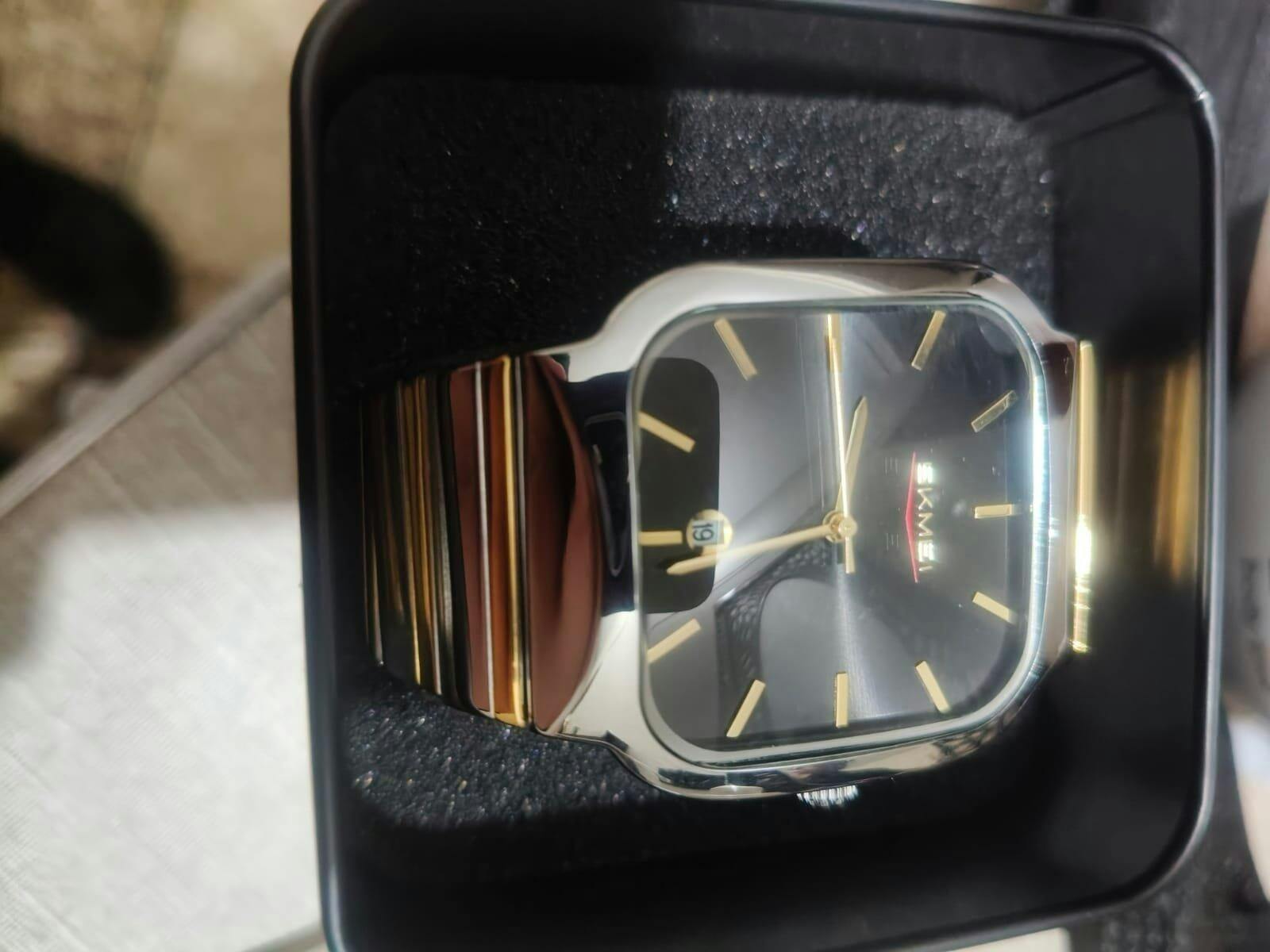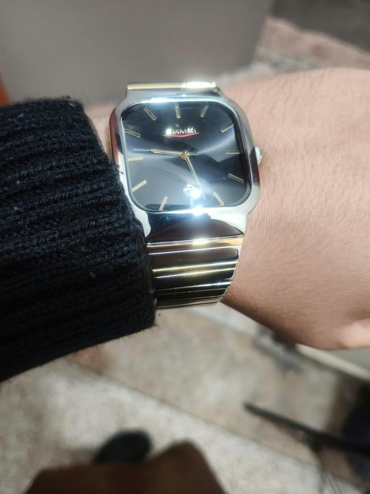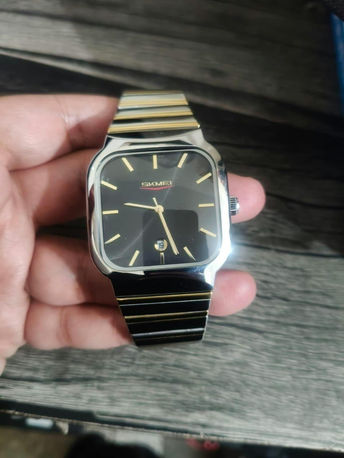 Dual-Tone Strap: Stainless steel band with silver and gold accents.