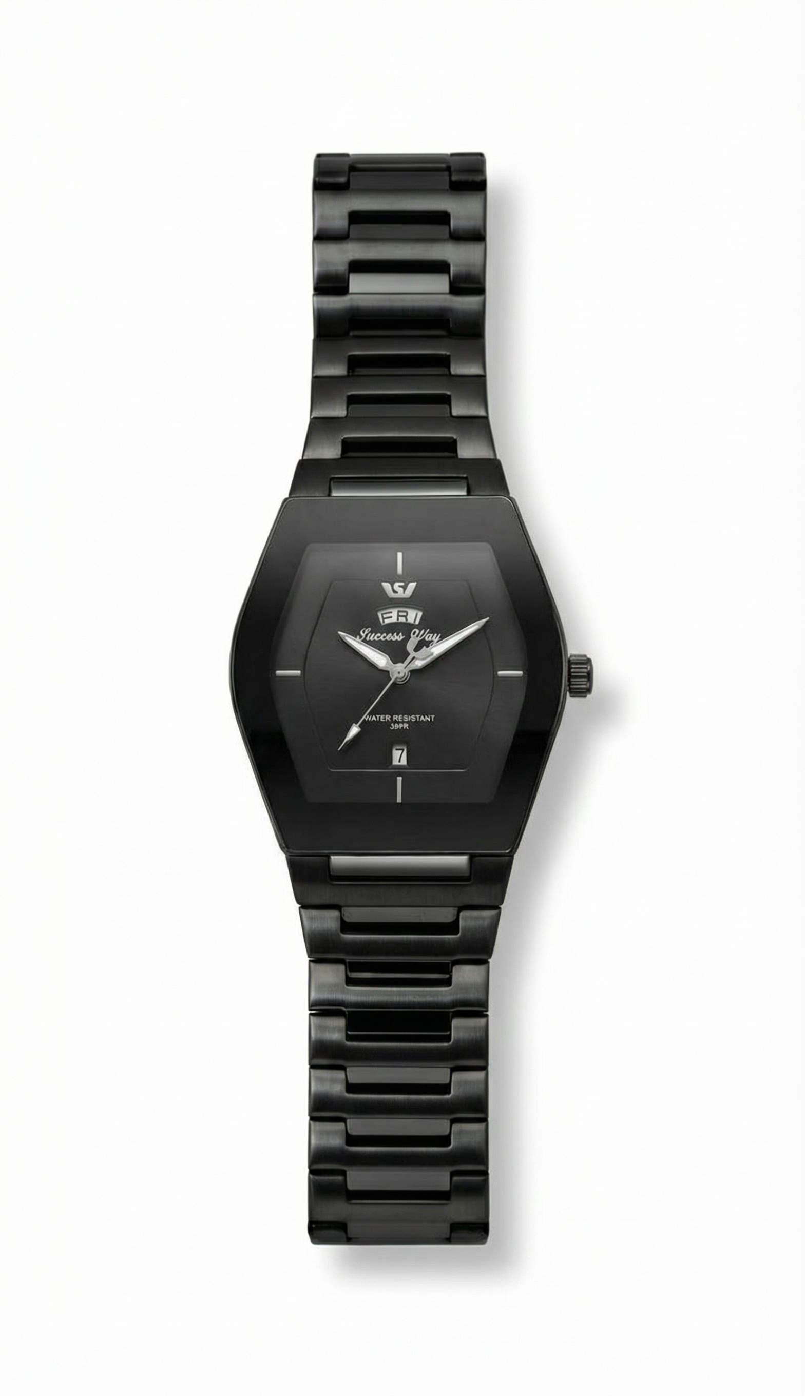 Redefine your wristwear with this – a timepiece that proves black is never basic. Featuring a striking, architectural case shape and a seamless integrated bracelet, this watch offers a sleek, continuous silhouette that stands out from the crowd of round watches. The matte black finish is accented by sharp silver hands, ensuring you can read the time (and the day) at a glance while keeping a low profile. It’s not just a watch; it’s an attitude.